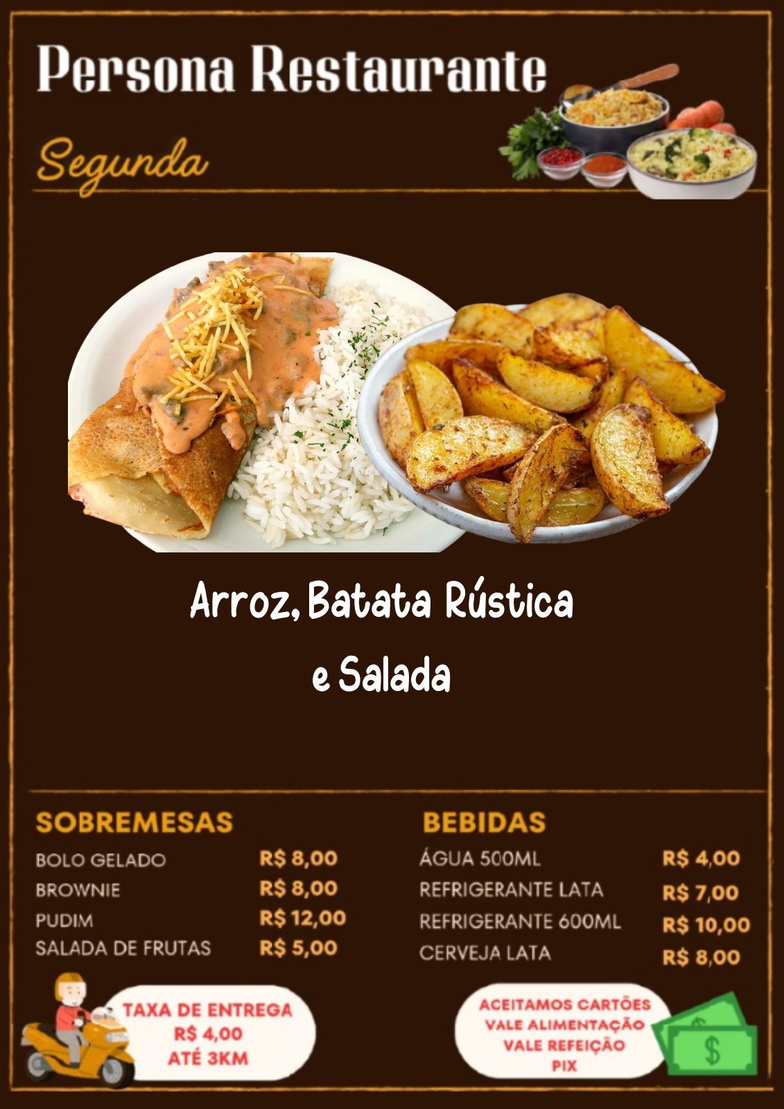 Panqueca de CarneArroz, Batata Rústica, e SaladaR$ 39,00