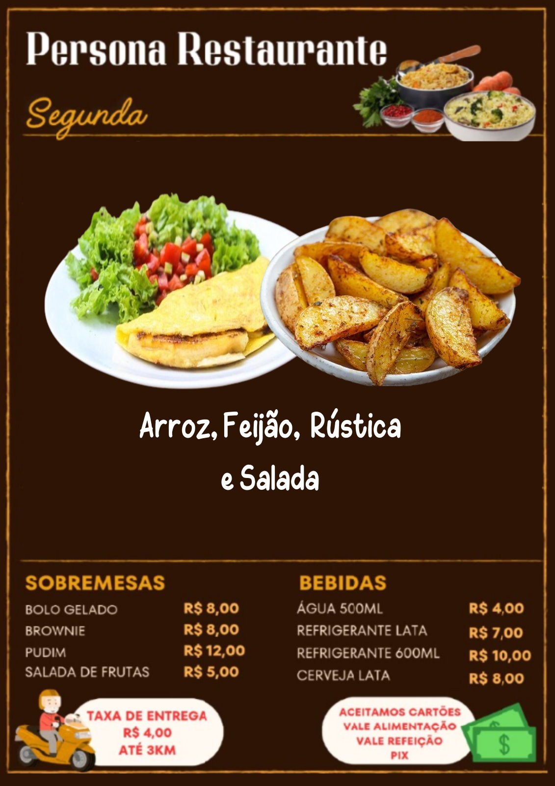 Omelete MistoArroz, Feijão, Batata Rústica, e SaladaR$ 39,00