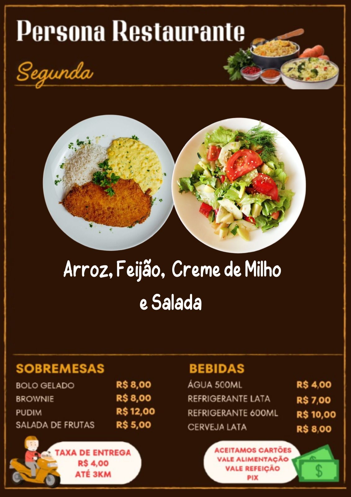 Frango Á MilanesaArroz, Feijão, Creme de Milho e SaladaR$ 39,00