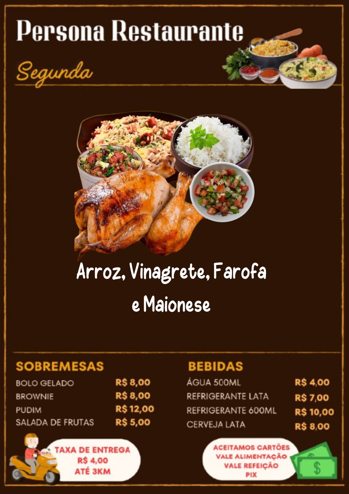 Frango na BrasaArroz, Vinagrete, Farofa, e MaioneseR$ 39,00